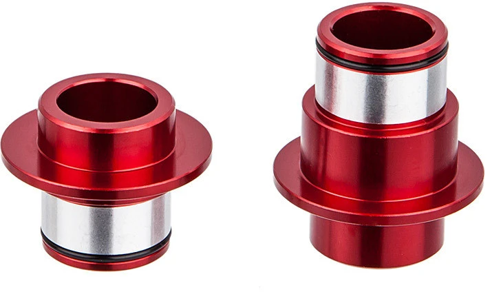 Adaptadores/reductores de ejes para convertir bujes de rueda delantera de 9 mm de cierre rápido o de 20 mm de eje pasante a eje pasante de 15 mm.