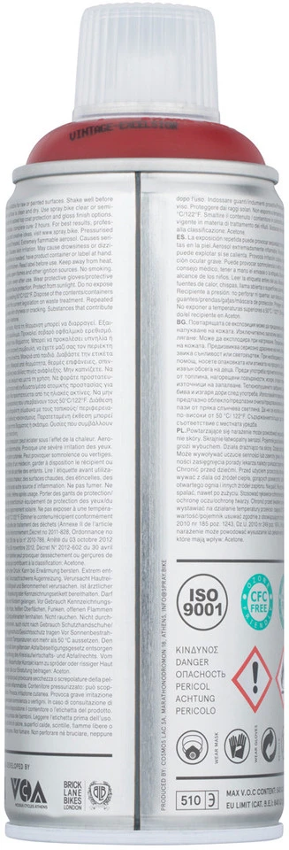 Advertencia del fabricante:Temperatura ambiente óptima durante la pulverización: 20-25°C. No usar el Spray.Bike a temperaturas exteriores por debajo de 10°C, por encima de 35°C o con una humedad relativa de más del 75%. Mantener la lata bien protegida de la luz solar y de temperatura ambiental superior a 50°C/122°F.Caracterización según normativa CLP: