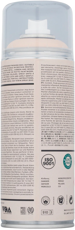 Advertencia del fabricante:Temperatura ambiente óptima durante la pulverización: 20-25°C. No usar el Spray.Bike a temperaturas exteriores por debajo de 10°C, por encima de 35°C o con una humedad relativa de más del 75%. Mantener la lata bien protegida de la luz solar y de temperatura ambiental superior a 50°C/122°F.Caracterización según normativa CLP: