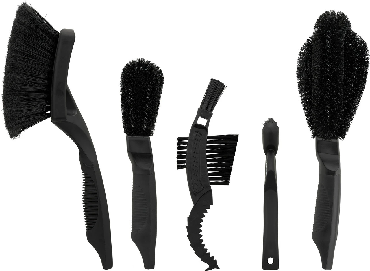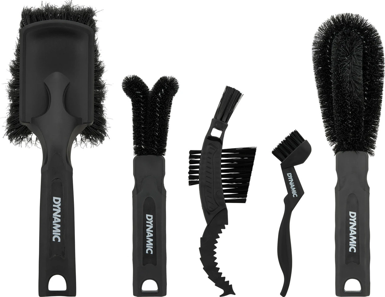 El set de cepillos Band of Brushes de Dynamic consta de los siguientes cinco cepillos: cepillo Soft Washing, cepillo Wheel and Components, cepillo Two Prong, cepillo Drivetrain Detailing und cepillo Claw. Vienen en una práctica caja para su almacenamiento. El set es adecuado para la limpieza completa de tu bicicleta, desde el cuadro hasta los componentes de la transmisión.