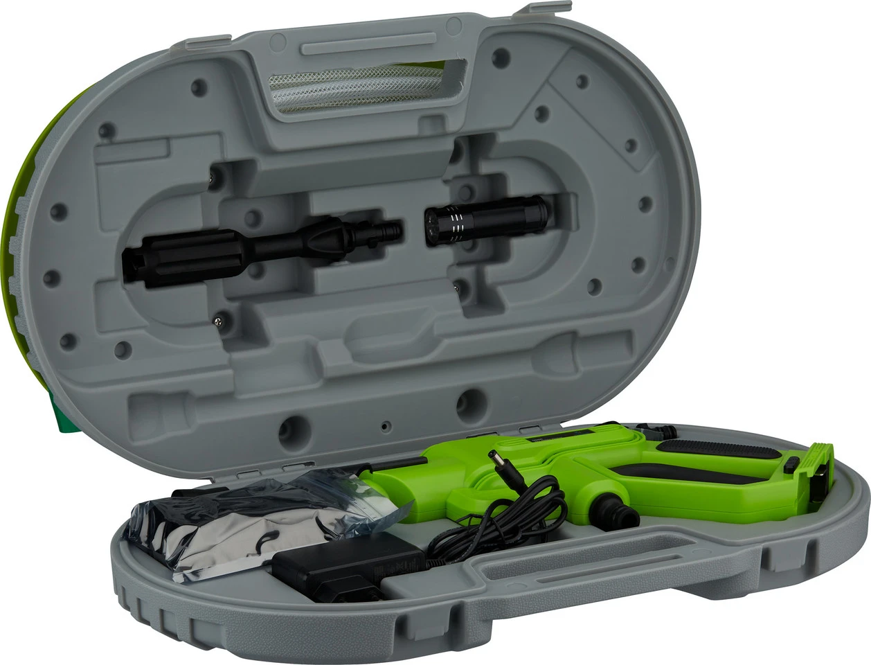 Volumen de envío:1 x Limpiador a presión aqua2go1 x Lanza de pulverización1 x Cabezal de boquilla1 Manguera de aspiración1 x Batería de iones de litio, 20 V 2500 mAh1 x Cargador de red1 x Estuche de transporte1 x Lámpara6 x Junta