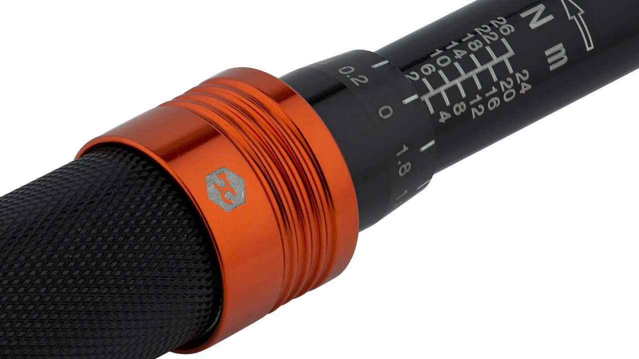 La llave dinamométrica Premium de bc basic para el taller de bicicletas se puede ajustar con precisión entre 2 y 26 Nm en pasos de 0,2 Nm, evitando así de forma fiable que los tornillos queden demasiado apretados o flojos. Su accionamiento cuadrado de 1/4″ de acero robusto es especialmente útil para el montaje de piezas delicadas de carbono. Sólo tienes que ajustar el par de apriete deseado y apretar el tornillo en el sentido de las agujas del reloj hasta que haga clic. El volumen de suministro de la carraca dinamométrica incluye también un juego de llaves de vaso hexagonales de siete piezas y dos accesorios Torx. Todo junto tiene cabida en el estuche práctico y robusto.