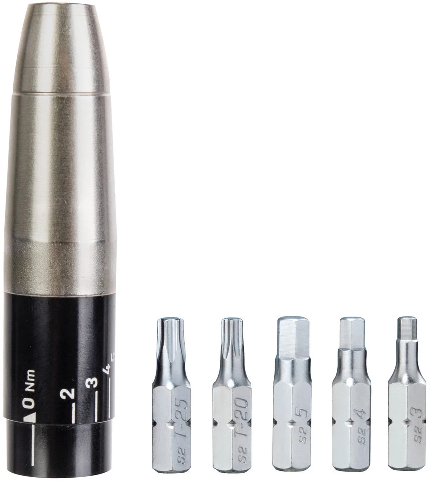 Casquillo de torsión compacto y fácil de leer que convierte cualquier mini herramienta con una llave Allen de 5 mm en una llave de torsión completa. El rango de ajuste de 2 a 6 Nm garantiza siempre el par de apriete adecuado para la mayoría de las uniones atornilladas de accesorios sensibles y piezas de carbono costosas.