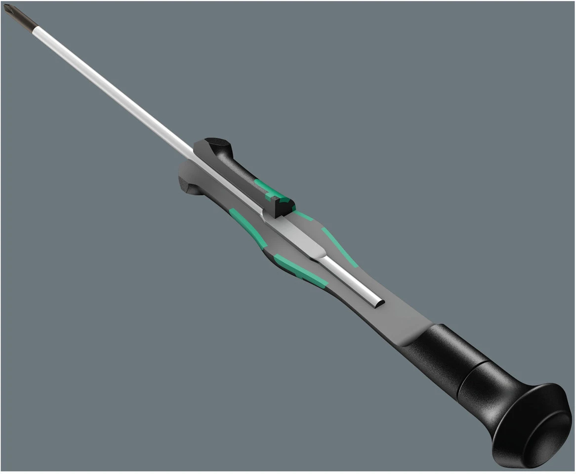 Juego de micro destornilladores de alta calidad de Wera para el atornillado mecánico de precisión. El apoyo de la mano en el capuchón giratorio y la zona de giro rápido bajo el capuchón giratorio permiten trabajar a la velocidad del rayo ahorrando el tiempo de estar reposicionando la mano.